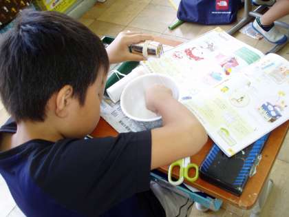 3年生は図画工作科の時間に,輪ゴムを使って動くおもちゃ作りに挑戦していました。それぞれのご家庭で準備していただいた容器や乾電池,輪ゴムを使い,興味をもって取り組んでいます。ご協力ありがとうございました。