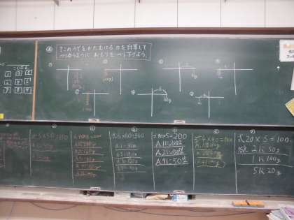 てこの腕を傾けようとする力を計算で求めることにしました。初めに、作用点側のおもりの重さと支点からのきょりを決めます。次に力点側のどこに、どれだけのおもりを吊り下げるとつり合うかを計算で求めてから実際に確かめました。その後、各班から問題を出し合ってみんなでつり合うところを考えました。