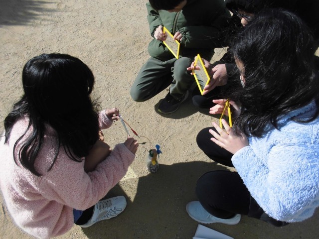 光電池に当たる光が多くなると、モーターが速く回るようになるか調べました。鏡ではね返した光を1枚分の時と3枚分の時とで比べました。