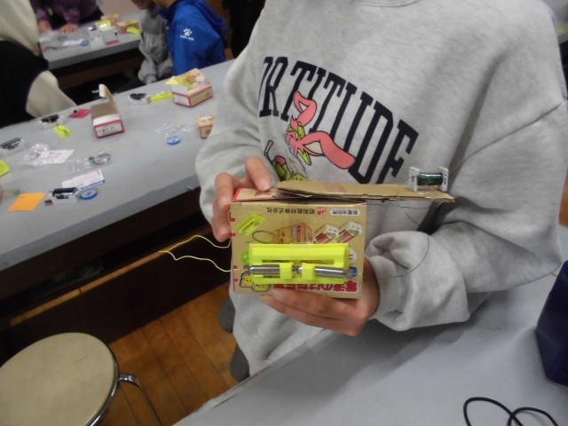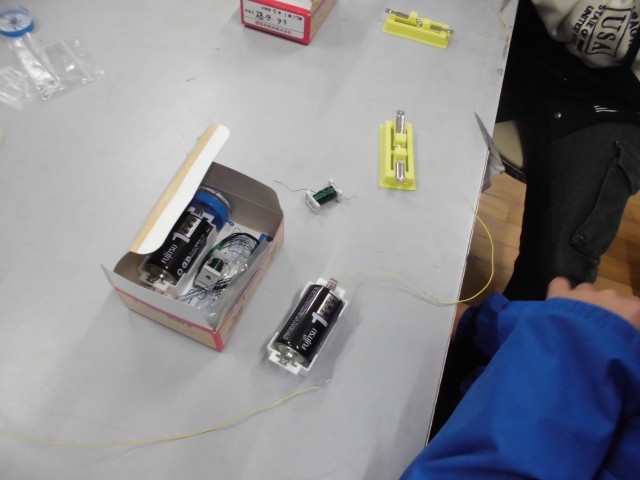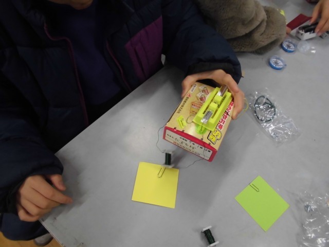 電磁石の性質を使って、カードつりゲームを作ります。乾電池とスイッチと電磁石をつないで、箱にセットをしました。カードにクリップを挟んで、電磁石で釣り上げる遊びを次回行います。