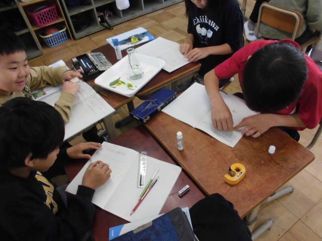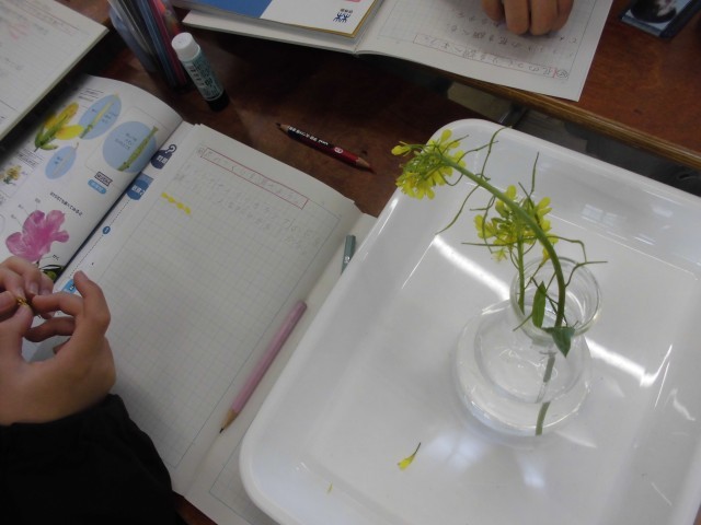 今日から理科の学習を始めていきます。初めに学習の進め方について話しました。その後、アブラナの花のつくりを調べました。小さな花の中には、花びら、がく、おしべ、めしべがあることを確かめました。
