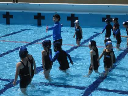ちょっと水は冷たいようです。でも,歓声をあげながら水の中を歩いたり,肩まで使ったりして水遊びを楽しみました。
