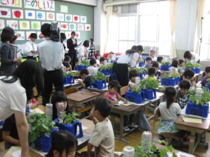 ベテランの先生の授業を見て,学んだことや考えたことを交流し合い,授業力を磨き合います。1年3組の子どもたちも,たくさんの先生方に囲まれて,はじめは少々緊張気味でしたが,すぐにいつも子どもたちに戻って活発に自分の思いを発表することができました。