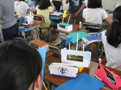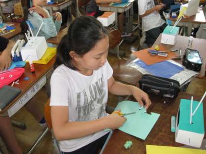 6年生が,工作をしています。針金を上手に折り曲げてクランクを作っています。クランクを回すことによって,面白い動きが生み出されます。折り曲げたところに何をつければいいのかな?考え中です!