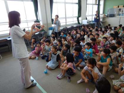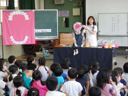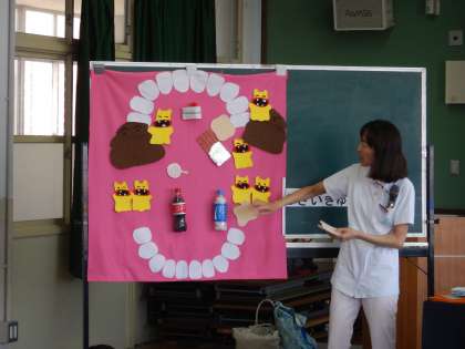 今日は学校歯科医の北村先生と衛生士の矢田先生に来ていただいて,1年生と4年生が歯みがき指導をしてもらいました。1年生のお話ではお人形の「もんちゃん」が出てきて,食べた後に歯みがきをしないと口の中がむし歯菌のうんこバリアとおしっこ酸で大事な歯に穴が開いてしまうことを教えてもらいました。正しい歯ブラシの大きさ、歯のみがき方も教えてもらい,持ち方は「こんにちわ」「さようなら」の2種類があることも知りました。1年生以外のお友達にも7月の保健だよりに詳しく紹介します。1年生のみんなは家族の人にも教えてくださいね。