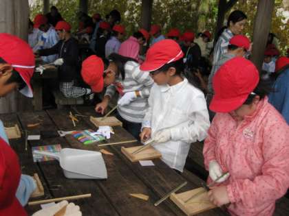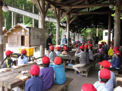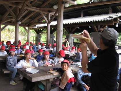山の家での最初の体験活動は、竹箸作りです。まず、所員さんお話をしっかりと聞きます。