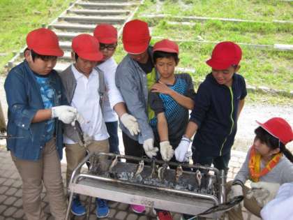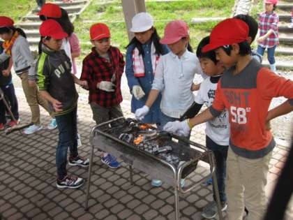 早くできた子供たちが待っています。やっと炭がいこって焼始めます。