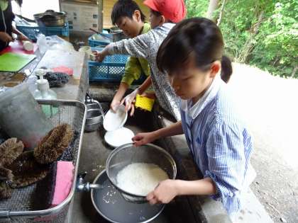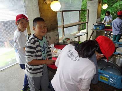 2日目の昼食は豚汁です。前日と比べて,火おこしや調理など,すべてがスムーズでした。