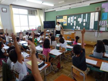 伏見中学校下4校合同授業研修会にて,2年3組が授業公開しました。1年生で学習した漢字を分類し,文を作って交流しました。