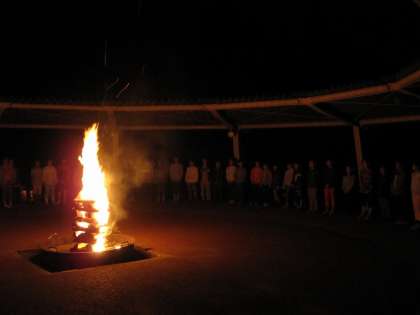 夕日が落ちて,キャンプファイヤーの炎がより一層明るく見えます。
