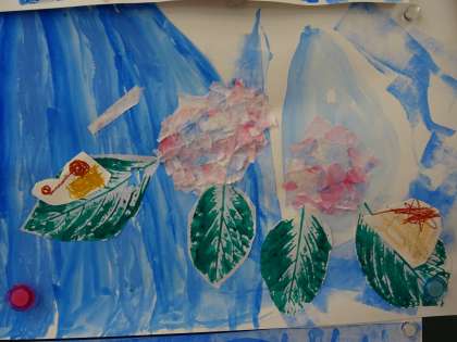 色水を使って染めた和紙を貼ったり,アジサイの葉で型をとったりしながら季節のアジサイを作りました。