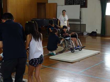 車いすに乗る役と介助する側に分かれて体験をしました。