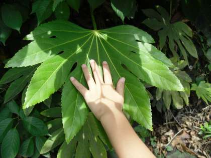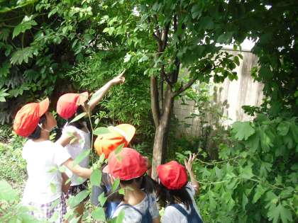 先日,一年生は夏を見つけに校内探検に出かけました。春とは違い,大きな葉や背の高いひまわりの花をみつけて観察していました。五感を使って観察したあとは,感じたことを思い思いの言葉で発表していました。