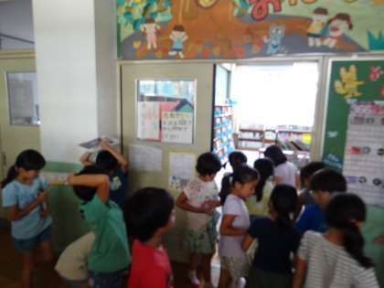 学校図書館へ行き,夏休み用の本の貸し出しを行いました。