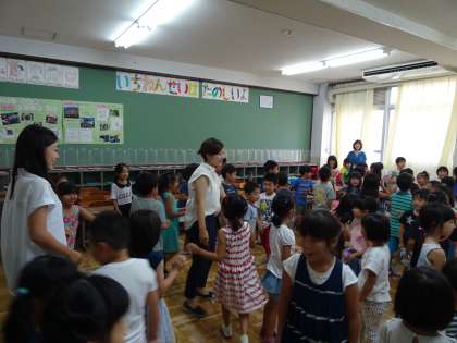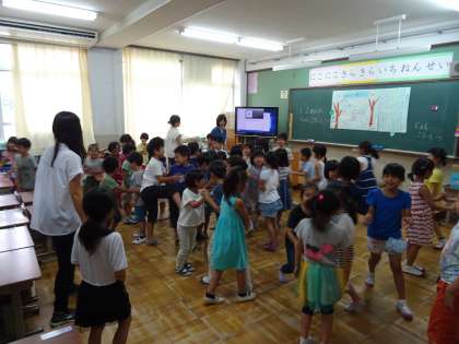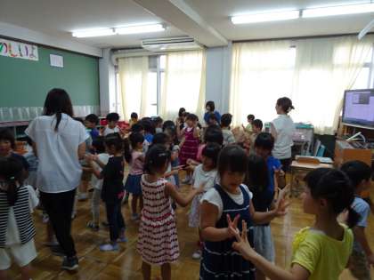 先生と一緒に英語の歌で楽しく体を動かしました。