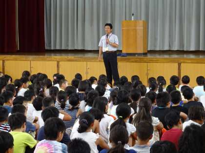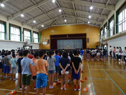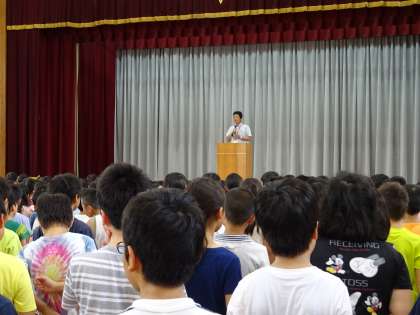 夏休み明け初めての朝会です。夏休み前に決めた目標のふり返りについてのお話がありました。