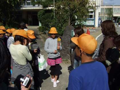 冷たい風が吹く中,昇降口に集まり出発。時間が押していたので,少し早足で歩きました。歩くたびに,体があたたまり,着ていた長袖の服を脱いで,半袖になっている子もたくさんいました。