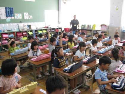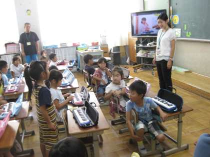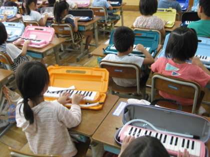 良い姿勢で椅子に座っています。鍵盤ハーモニカを演奏する前に,まず,机のどのあたりに置くのか,どんな姿勢で吹けば良いのかを教えてもらっています。