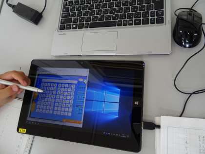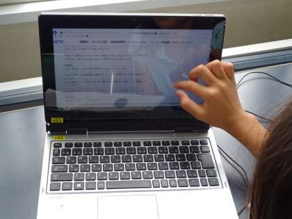 子どもたちが調べ学習で使うコンピュータもタブレット端末に変わっています。キーボードを着脱可能ですので,持ち運ぶことも可能です。