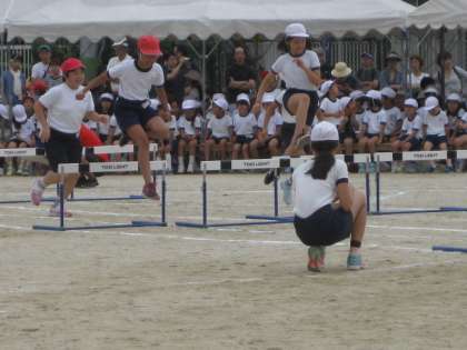 5年生のハードル走では,ハードルに引っかかる子が多かったですが,それだけ,ハードルを低い位置で跳びこそうとチャレンジしていました。綺麗に跳びこせる子がとても多くてレベルの高いハードリングでした。