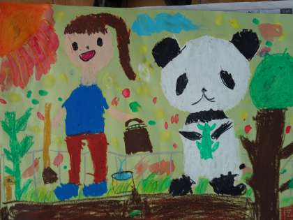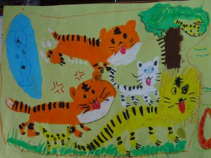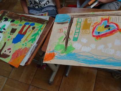 1年生のお話の絵です。パスを使って,色鮮やかに描いていきました。