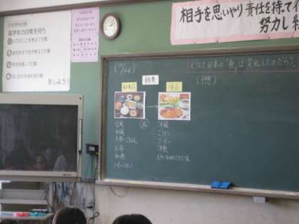 このクラスでは,社会科の授業です。和食について学習しています。和食は,ヘルシーで美味しいということで,世界的に注目されていますね。