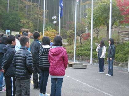 稲荷小・新町小・花園小と合同で朝の集いです。学校の旗を揚げ,それぞれの学校を紹介しました。