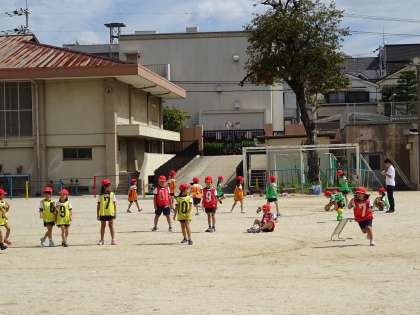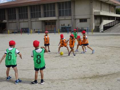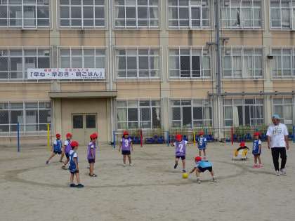 1年生の「ころがしドッジボール」の様子です。チームで作戦を考えて,ボールを転がしてゲームを進めます。チームの作戦が勝敗を分けます。
