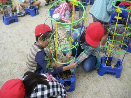 今日は生活科の学習であさがおの観察をしました。一生懸命にそだてたあさがおはぐんぐん成長し,夏にはたくさんの花を咲かせました。まずは種を観察し,その後に友達と協力しながら長く伸びたつるをほどいていきました。