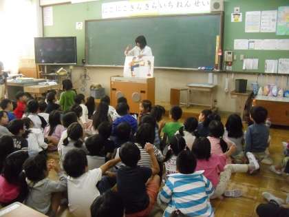 1年生の伏水タイムの学習の様子です。今週は新しくいろいろな動物や体の名前が出てくる,英語の絵本を楽しみました。体の動きをまねしたり,お話に出てくる言葉を声に出したりしながら楽しく学習しています。