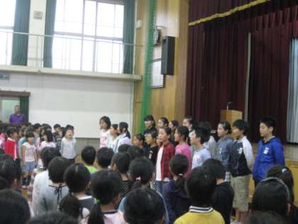 音楽委員会のメンバーが前に整列して,全校合唱が始まりました。給食時間に毎日流れていることもあり,綺麗な歌声でしっかりと歌えることができました。