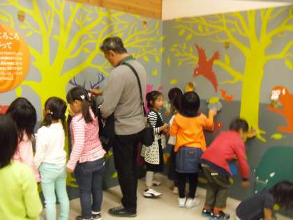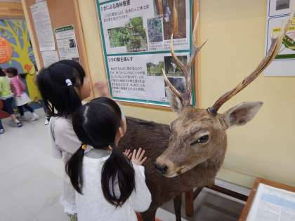 お話を聞いた後は施設の展示を見ていきます。動物のはく製やどんぐりのおもちゃなど,触れたり遊んだりしながら学習していました。