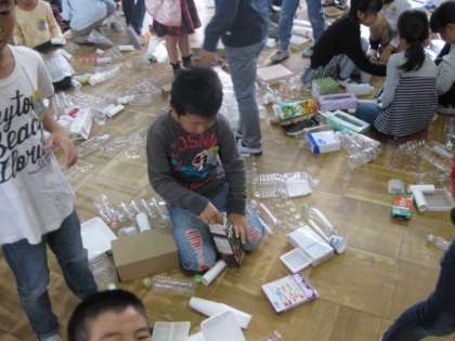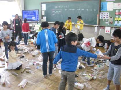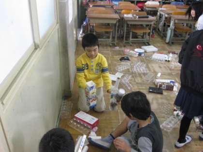 こちらの2年生は,自分のお気に入りの廃品をもってきて,どんな遊びができるか調べています。