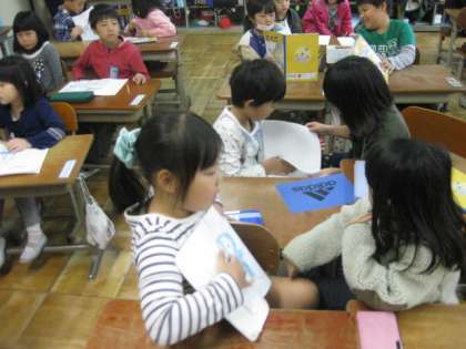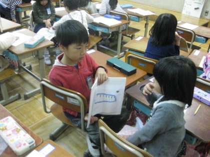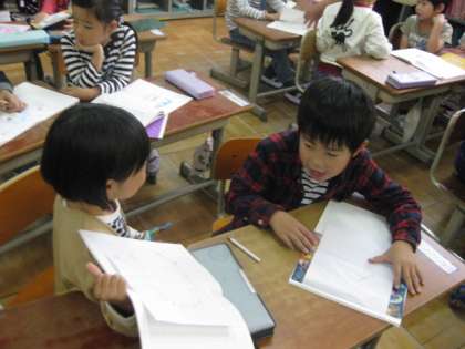 自分のノートを隣の席の子に見せて,熱心に説明をしています。自分のお気に入りのものを相手に分かりやすく伝えています。伝える方も聞く方も大切ですね。