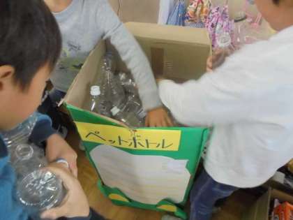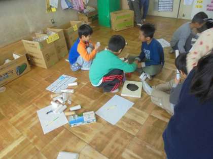 家で集めてきた廃材を使って様々な遊びや遊びに使う道具を作っています。今日はグループごとに分かれてみんなに楽しんでもらうための遊びの工夫を考えていました♪