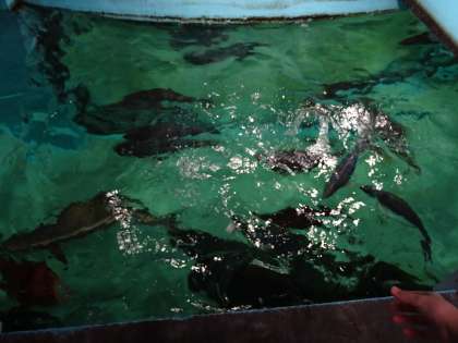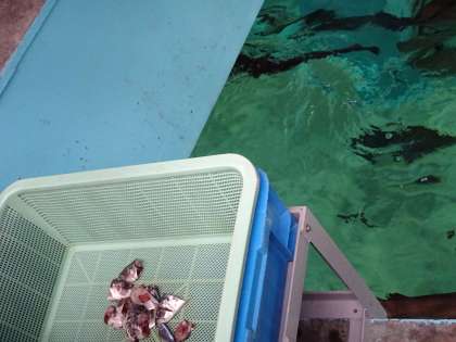 魚が勢いよく餌を食べに来ました。子どもたちからは歓声が上がりました。