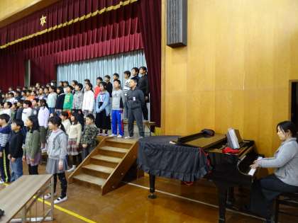 5年生は道徳劇に取り組んでいます。歌唱のシーンです。