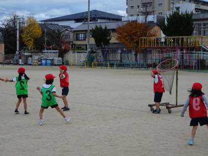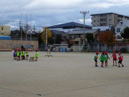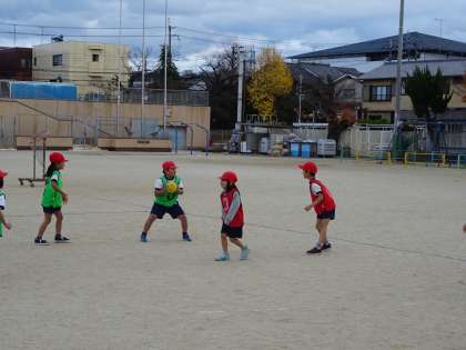 1年生のパスゲームの様子です。ドリブルはできませんので,同じチームの友達が空いたスペースへ移動してくれると,パスがつながります。