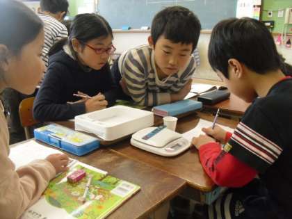 少し前の算数では,上皿自動ばかりを使って学習しました。今回理科では,デジタルばかりを使ってものの重さを調べました。