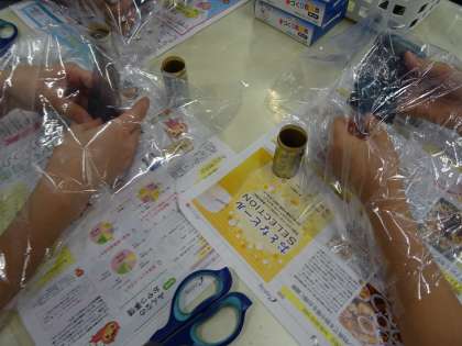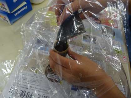 まず,亜鉛缶にセパレータ底紙を入れ,二酸化マンガン電解液を入れました。。