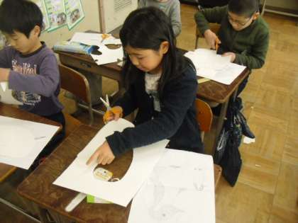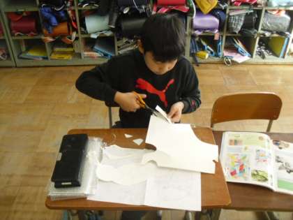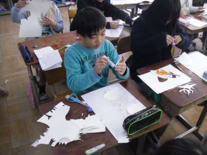 図工の学習で、版画づくりを行っています。主題「動物(鳥)」から画用紙や用意したものを貼りあわせています。