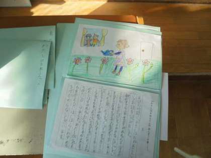 国語の学習で「わたしはおねえさん」の紹介カードを書きました。自分が一番心に残った場面の絵とともに,お話のあらすじと自分自身と登場人物を比べた感想を書きました。