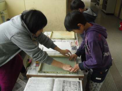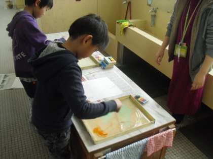 図工では紙版画の作品づくりをしています。今日は,和紙にマーブリングをしました。
