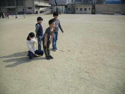 地面の上に四角や三角の印をつくり,ケンケンで進んでいきます。少し難しくなると石を投げて,四角の中に入れます。それをケンケンをしながらとります!