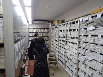 地下の閉架書庫も見せていただきました。子どもたちは,一年間の新聞が保管されていることに驚いていました。