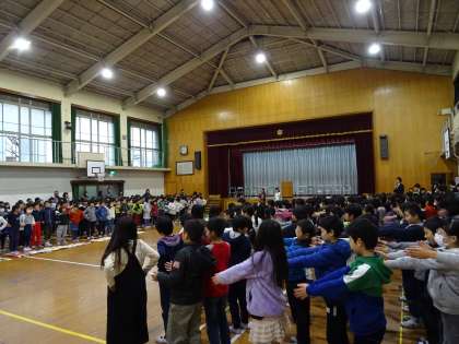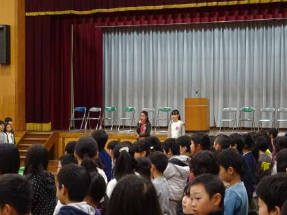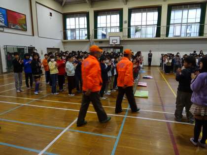 3月5日(月)児童朝会において,「子どもを見守る会」の感謝式を行いました。見守る会の方の入場です。