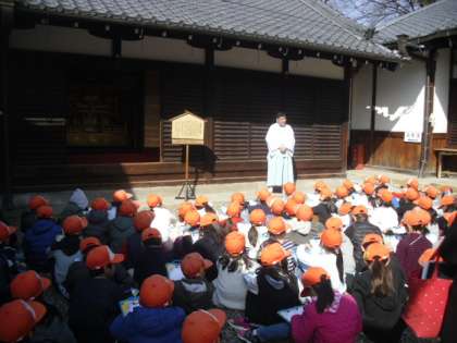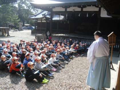 社会科「地域に受けつがれるもの」の単元で,本日は地域の神社へ社会見学へ行きました。神社の歴史や,毎年行われるお祭りについて詳しく教えてもらいました。