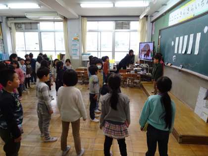 1年生の各教室で楽しく遊びました。この学級では,英語の歌に合わせて,みんなで踊りました。