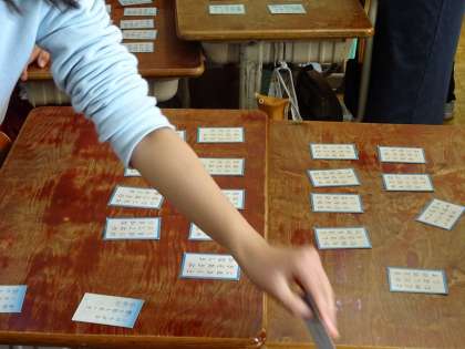 中には,上の句がよまれるとすぐに札を取る子どももいました。