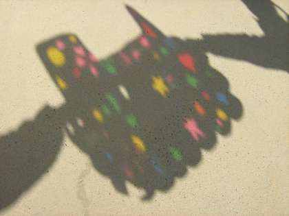 厚紙にグループでいろいろな模様を描いてくりぬき,セロハンをはりました。それを光にかざすと,きれいな色のもようが床や地面にうつります。